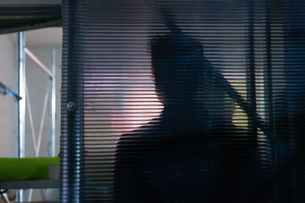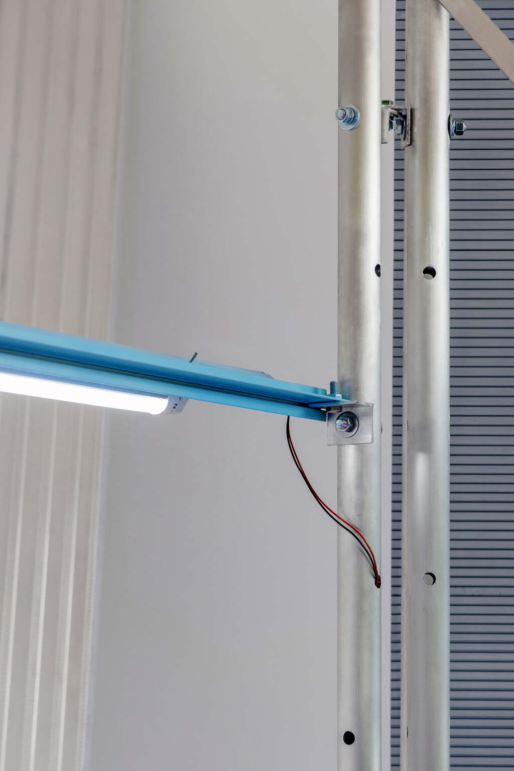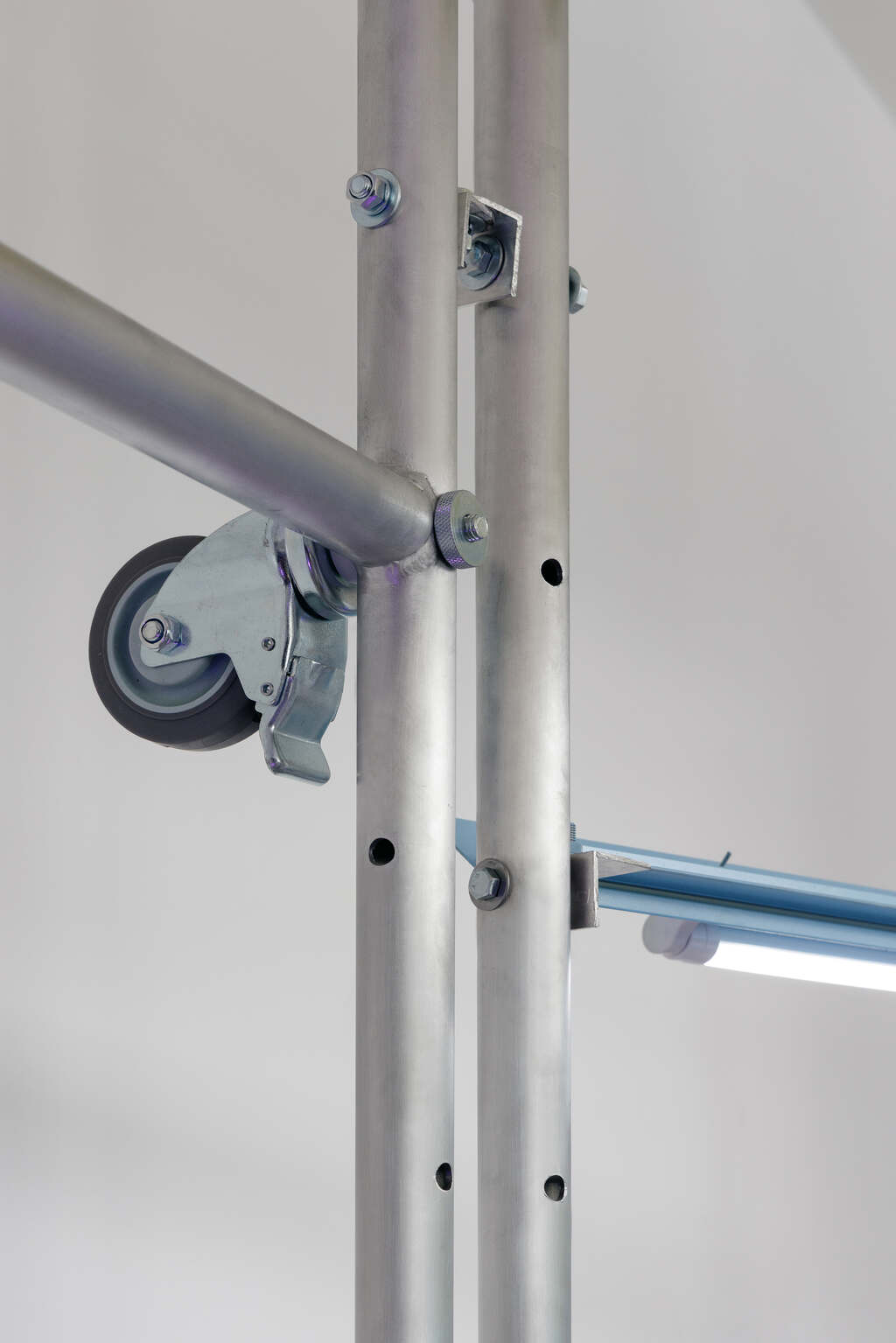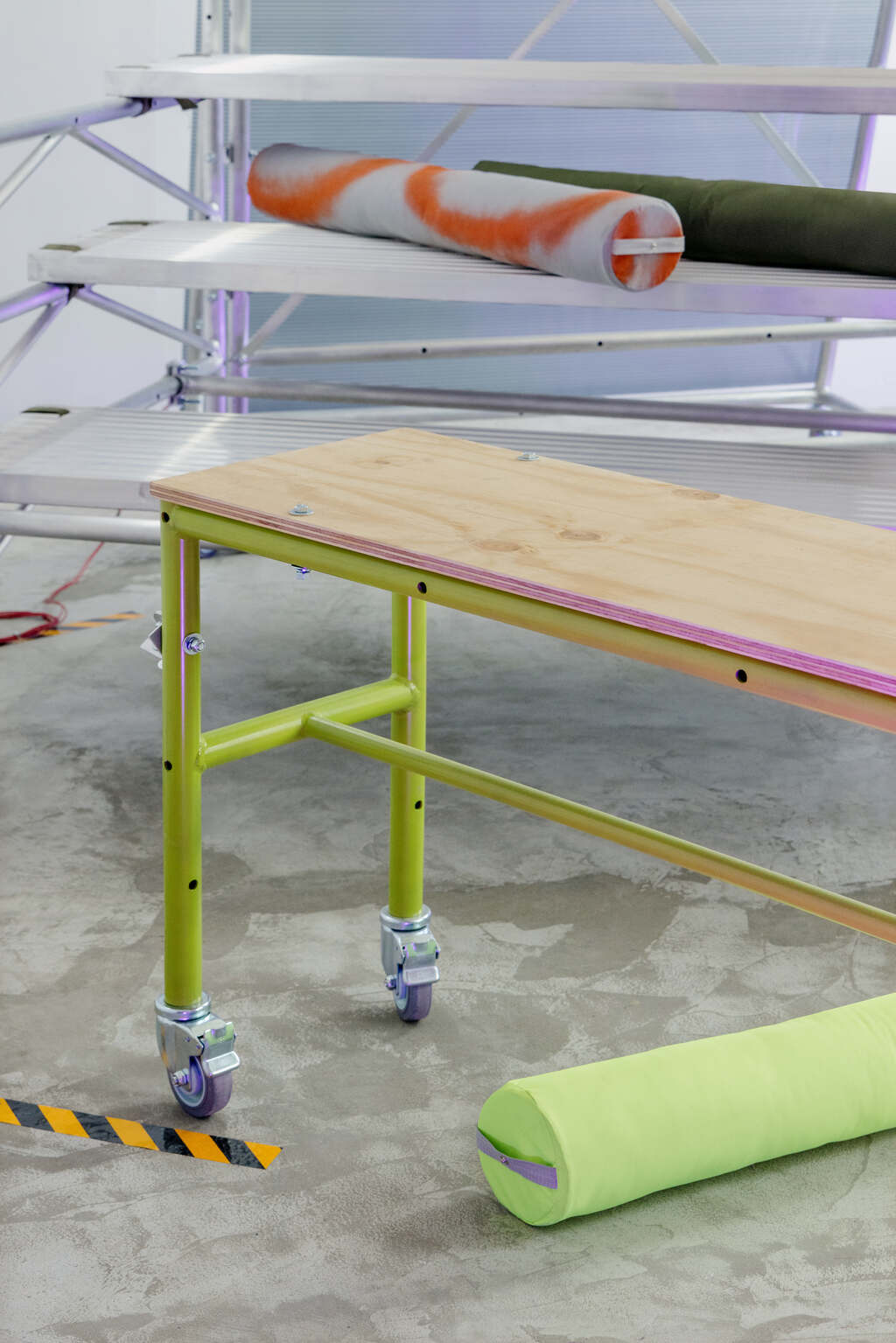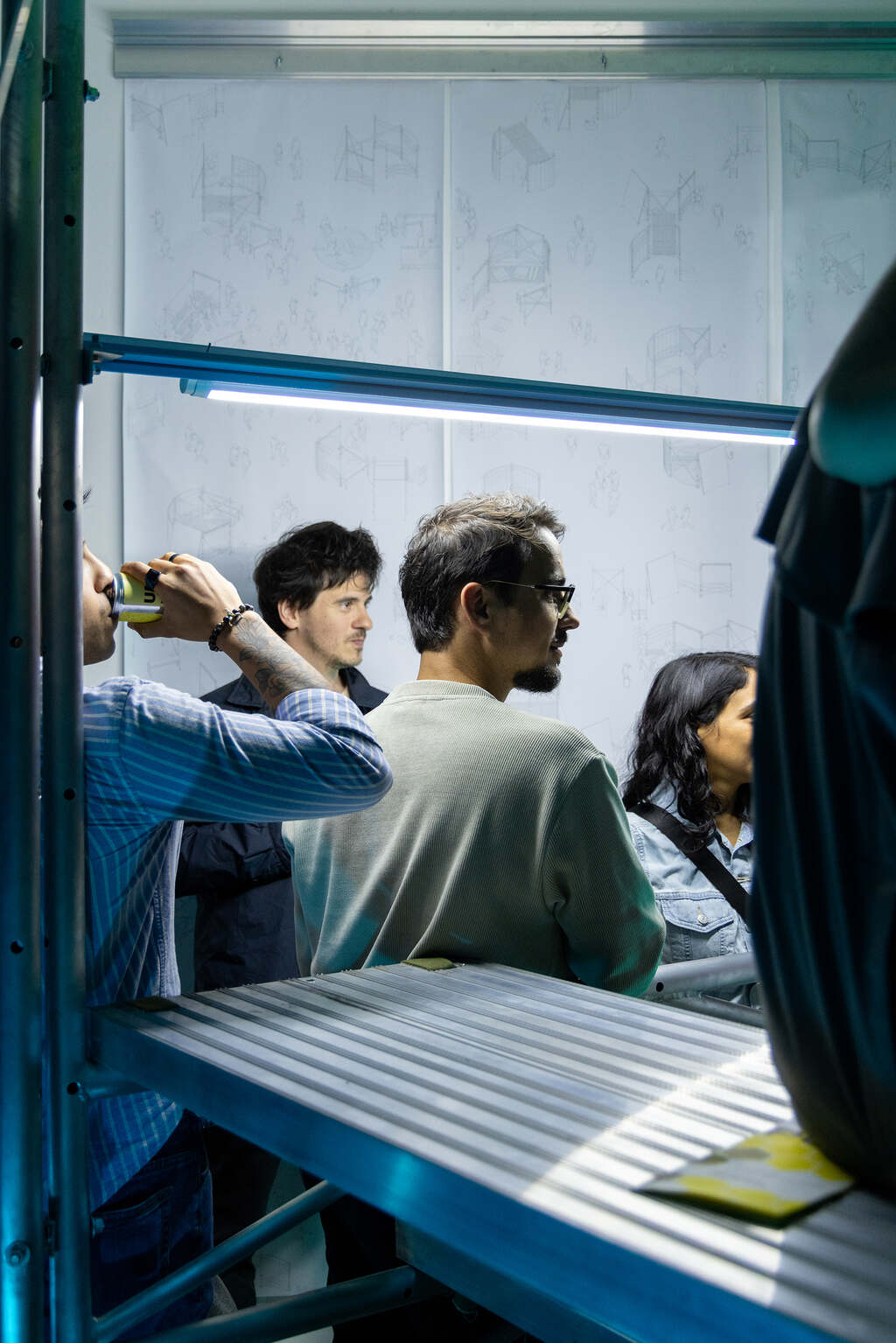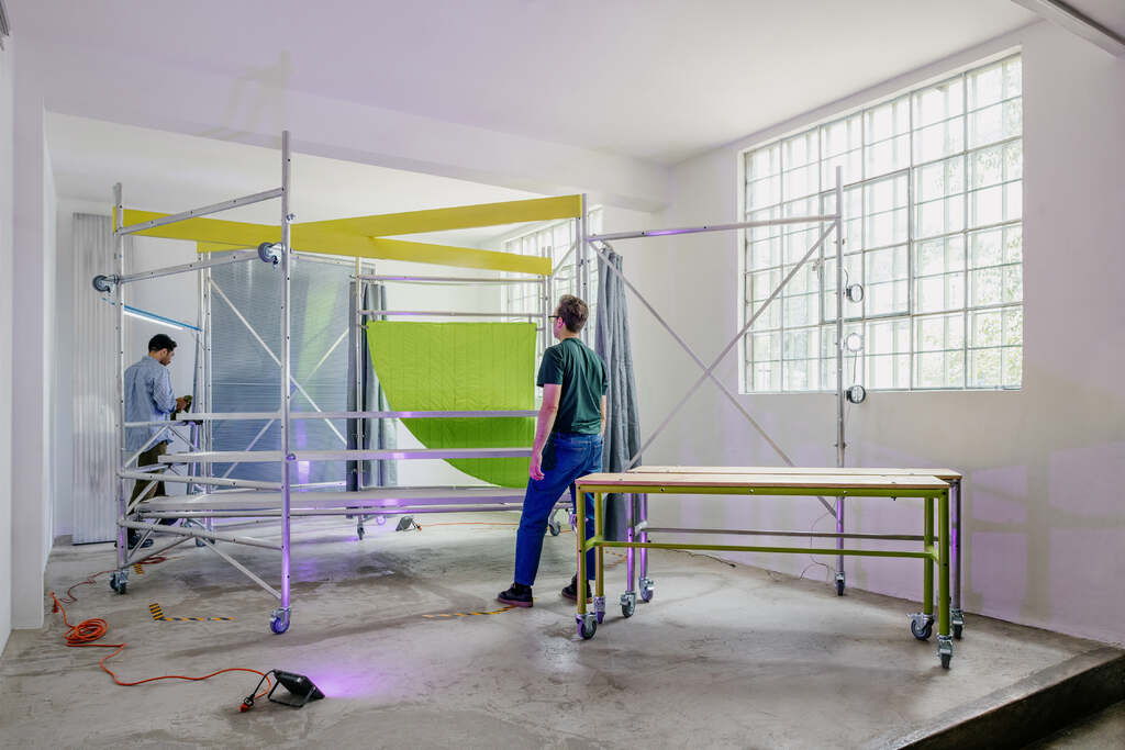 The installation embraces LIGA as a “third space,” a site that exists outside the confines and routines of daily life in which alternative social dynamics can unfold. Zones for gathering, making, and resting are bundled together within a mobile, open structure that sits within the gallery. Conceived as a prototype that blurs the lines between architecture, infrastructure and industrial design, the base organization of the piece takes the form of a hexagon composed of six different aluminum frames, all linked together with operable hinges. To accommodate a variety of uses throughout the day, discreet furniture-scaled modules unfold from the center frame to extend living space throughout the gallery and out into the entrance hallway. Materials and construction methods embrace industrialized systems and prefabricated parts that allow for the structure to be modified over the length of the exhibition calendar.