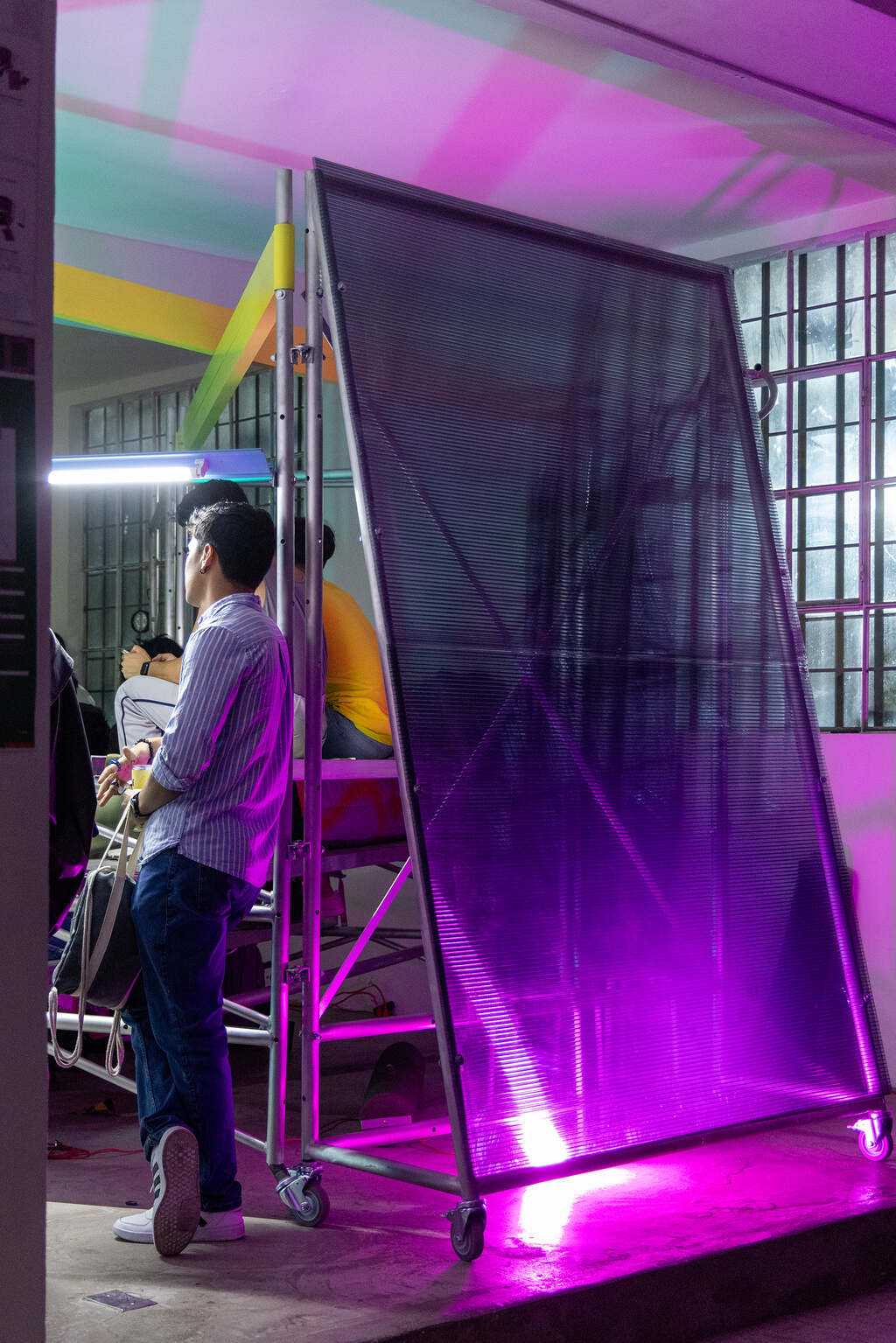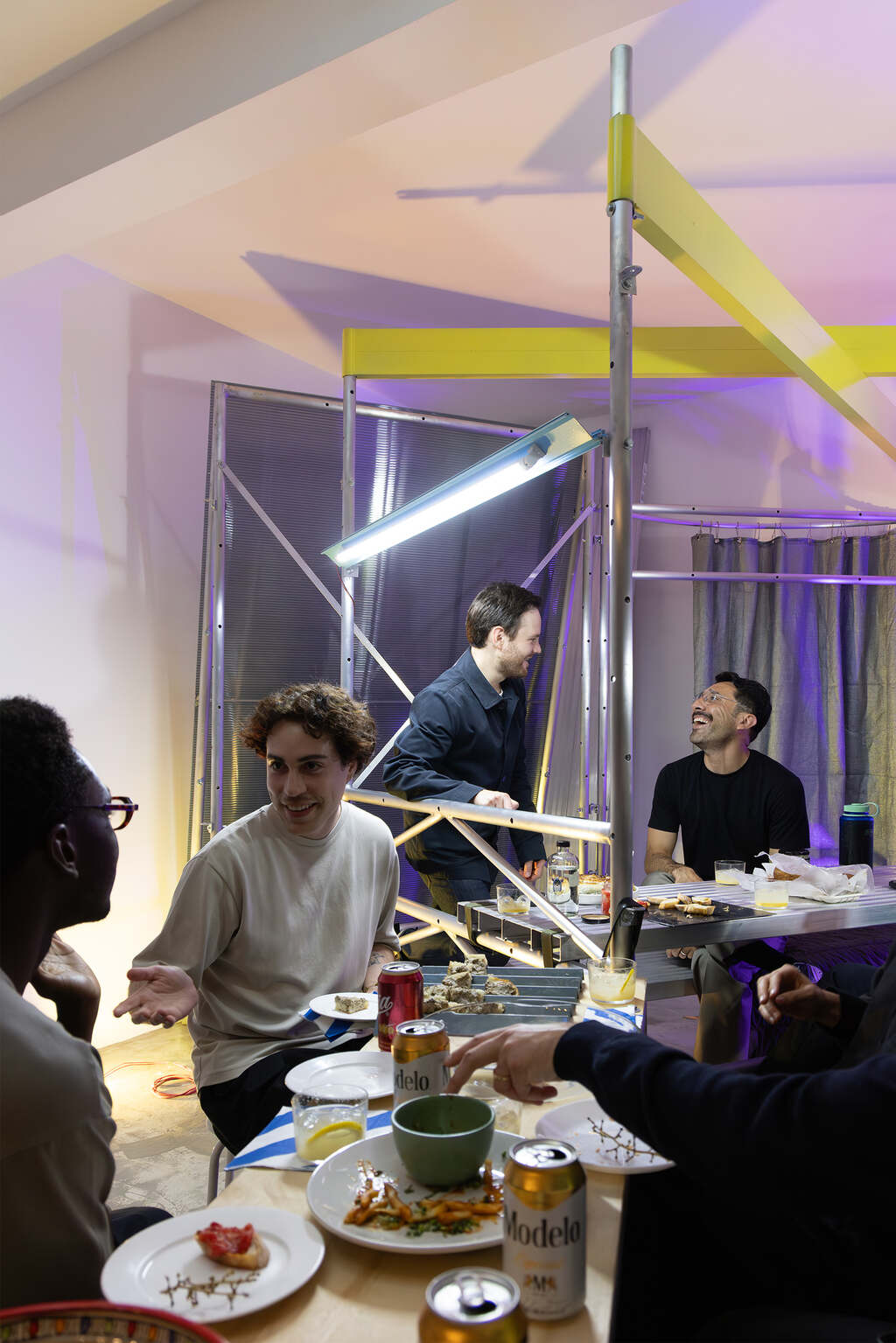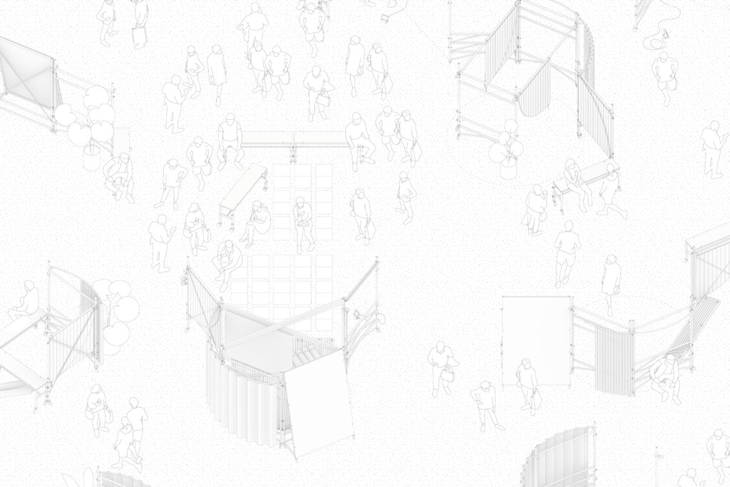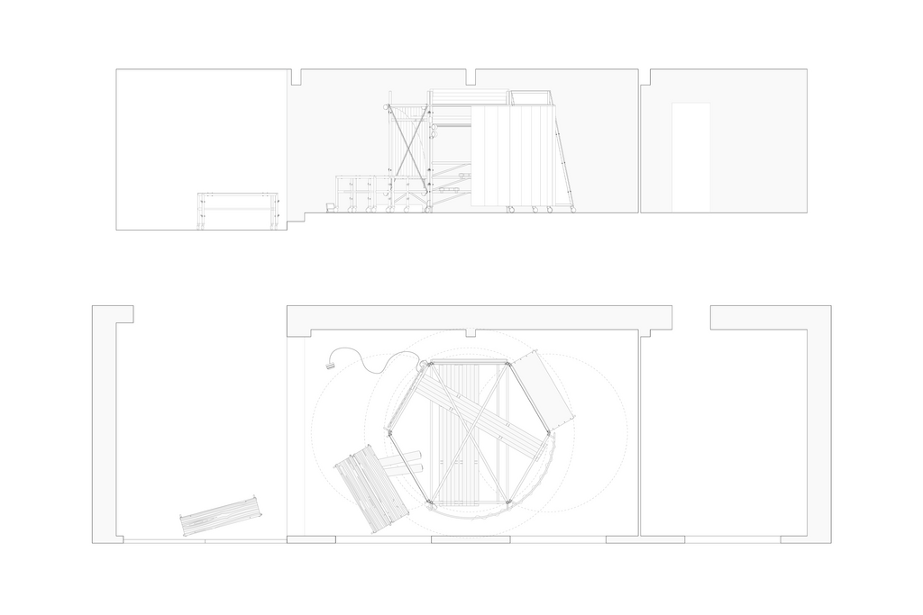 La instalación aprovecha el espacio de LIGA como un “tercer espacio,” el cual existe en un lugar fuera de los confines y la rutina de la vida cotidiana, y en donde puedan desenvolverse dinámicas sociales alternativas. Zonas para el encuentro, la producción y el descanso son agrupadas en un marco estructural móvil y abierta, el cual se posiciona dentro de la galería. Concebida como un prototipo que difumina las fronteras entre arquitectura, infraestructura y diseño industrial, la organización base de la pieza toma la forma de un hexágono compuesto por seis marcos de aluminio diferentes, todos unidos entre sí mediante bisagras operables. Para satisfacer distintos usos a lo largo del día, discretos módulos a la escala del mobiliario se desenvuelven de la estructura central para extender el espacio habitable a través de la galería y hacia el pasillo de acceso. Los materiales y métodos de construcción aprovechan algunos sistemas industrializados y partes prefabricadas, permitiendo a la estructura adaptarse y ser modificada a lo largo de la duración total del calendario de la exhibición.