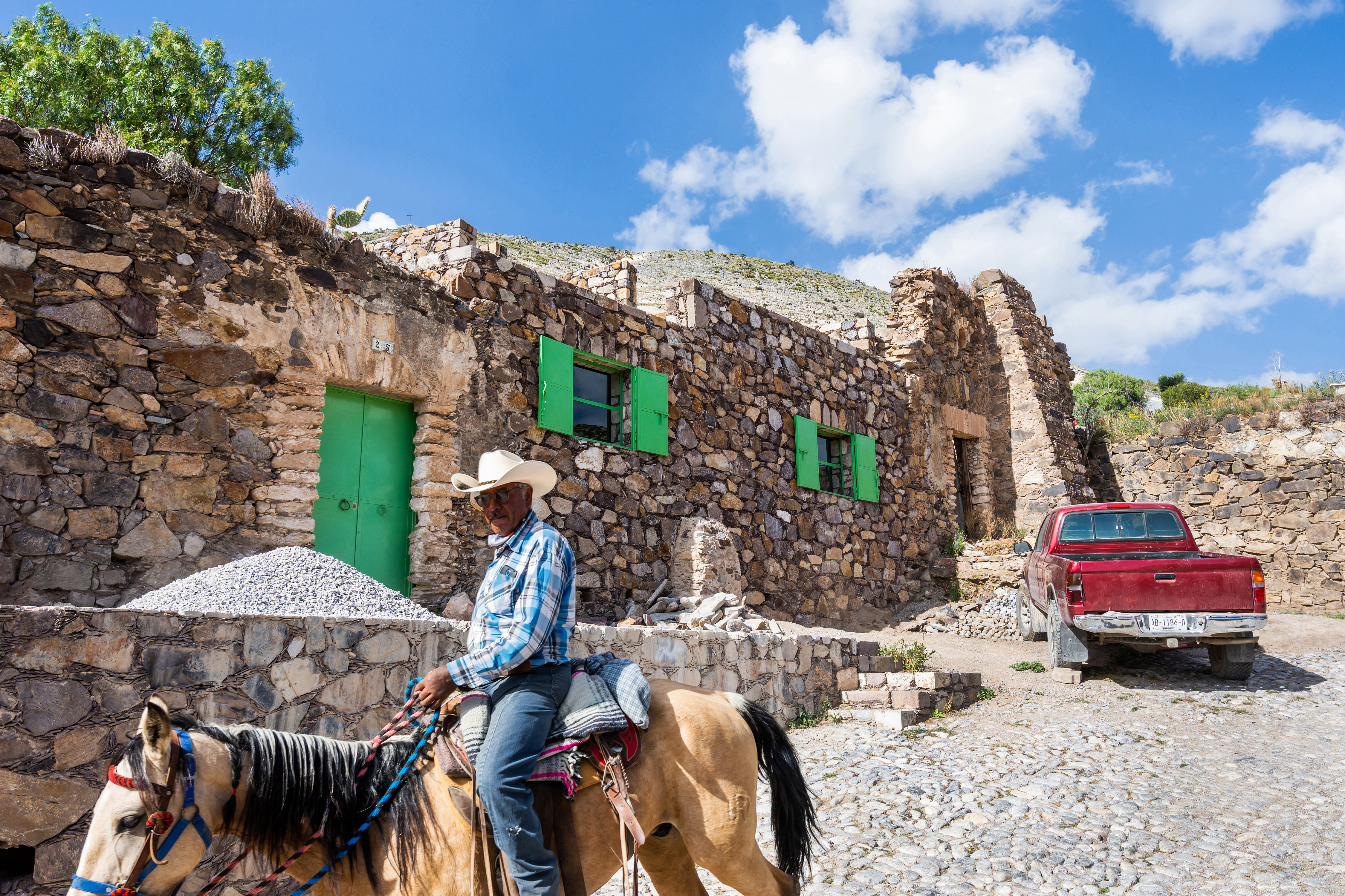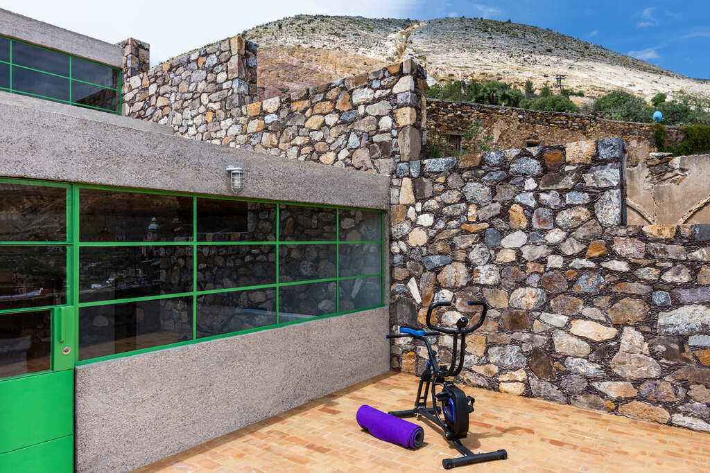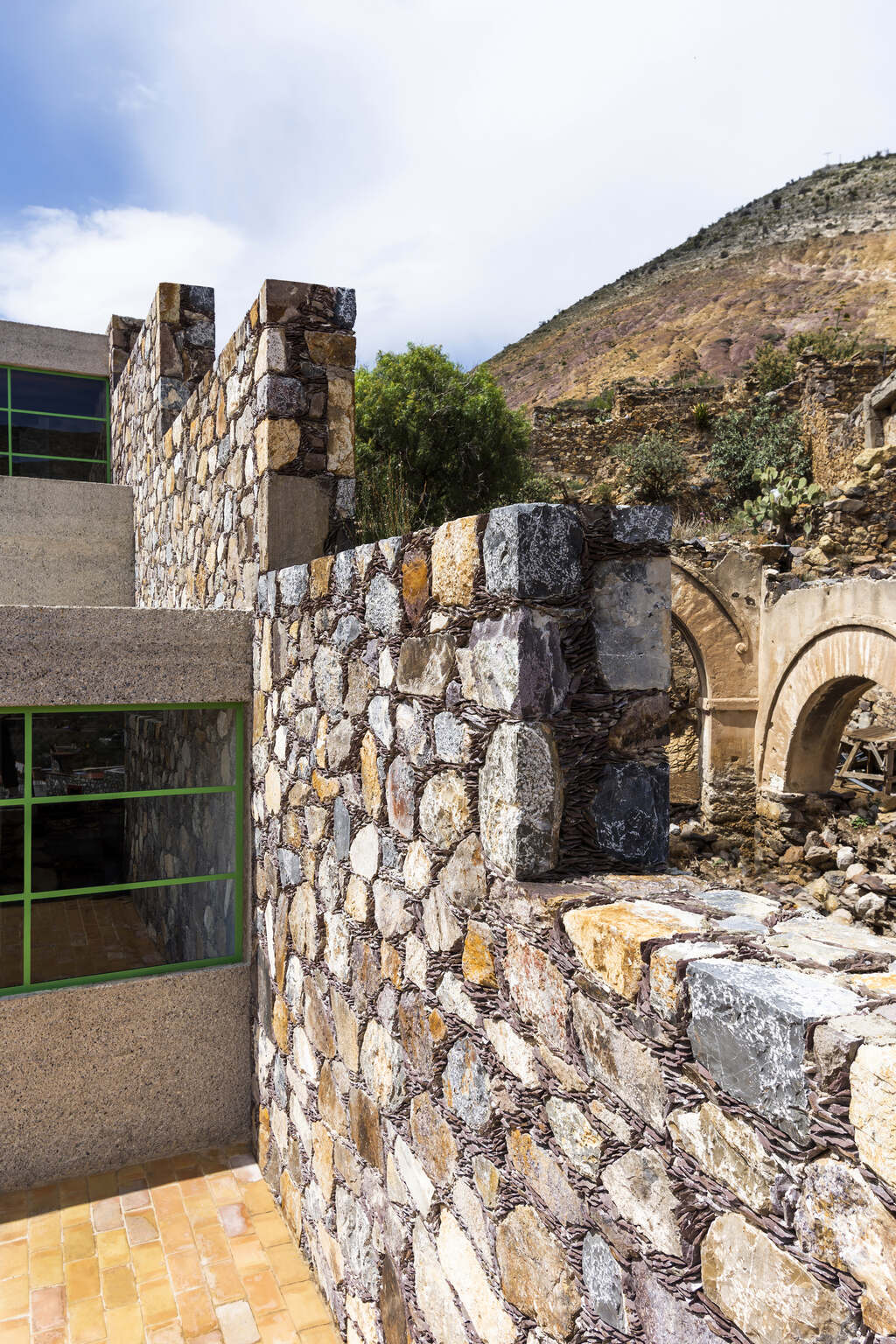 Localizado en Real de Catorce, un antiguo pueblo minero fundado durante el siglo XVIII para llevar a cabo la sustracción de plata, el proyecto cumple con las estrictas regulaciones de construcción locales y fue revisado públicamente por una junta supervisora. Además de temas de altura y restricciones de líneas de visión, las regulaciones de construcción especifican que todos los muros exteriores deben ser construidos con piedra local por medio de un sistema constructivo tradicional representativo del pueblo. En paralelo al desarrollo esquemático del proyecto, dichas regulaciones de construcción iniciaron consideraciones de diseño inmediatas que lo impactaron hasta la escala del detalle. Esto incluyó la reparación, reforzamiento y expansión de muros sólidos de piedra existentes en el sitio, así como también la construcción de nuevos muros utilizando un método de construcción modificado y más económico, el cual utiliza piedra, cemento colado y bloques de cemento.