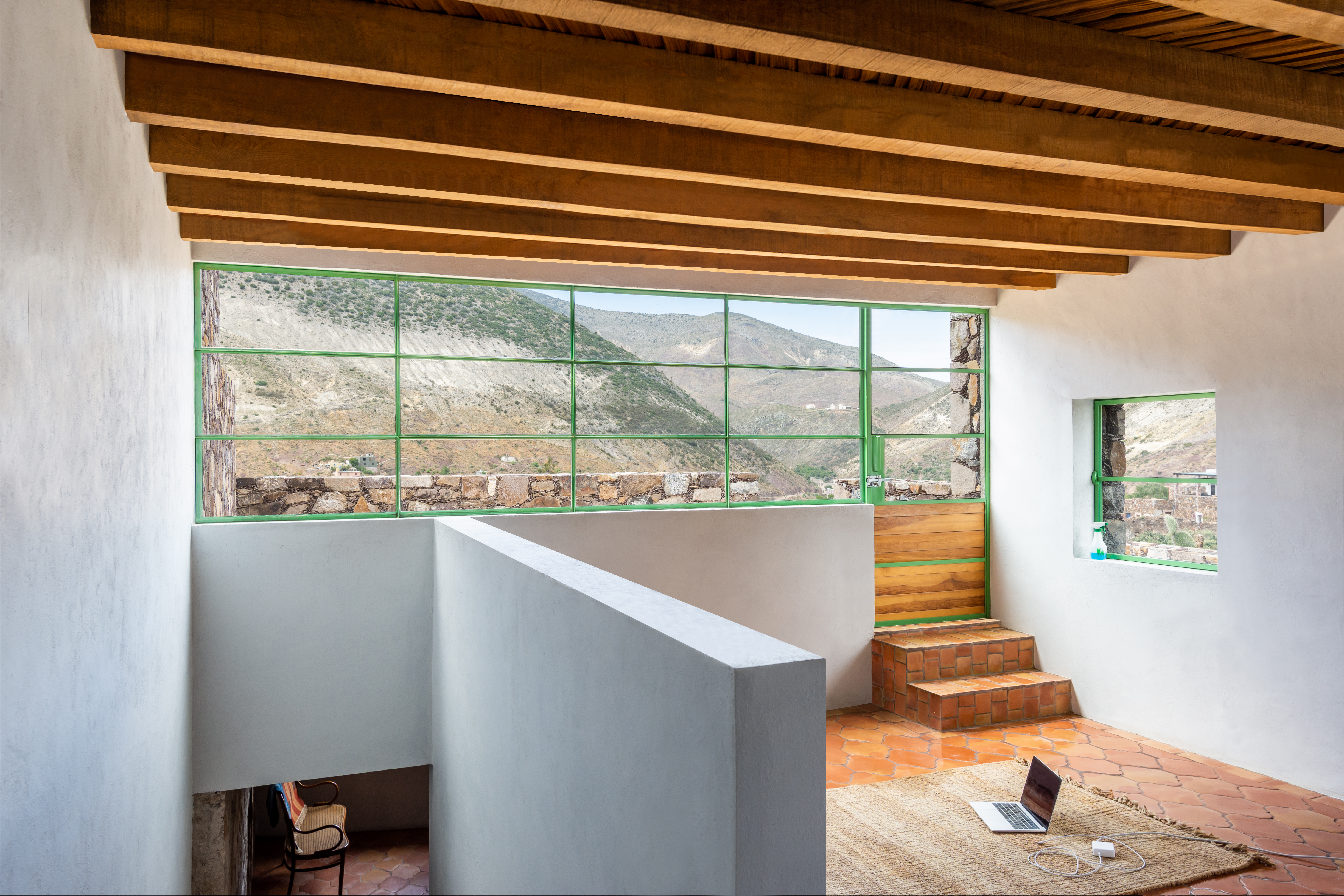 Casa Georgina is composed of two apartment units built into the steep slope of the Sierra de Catorce mountains in the northern Mexican state of San Luis Potosí. The project sits within a walled garden that contains an existing house and builds upon a series of stone ruins, engaging them through a play of addition and subtraction. Three stepped walls organize the design scheme: wall one contains exterior circulation; wall two frames the interior living spaces; and wall three divides the project from the neighboring property. These walls protect interior spaces from intense direct sunlight from the east and west, and structure a collection of terraced volumes. Roof patios open to the south and provide expansive views of the surrounding landscape.