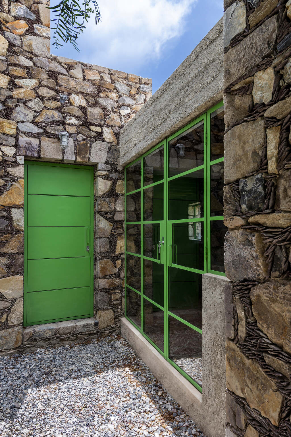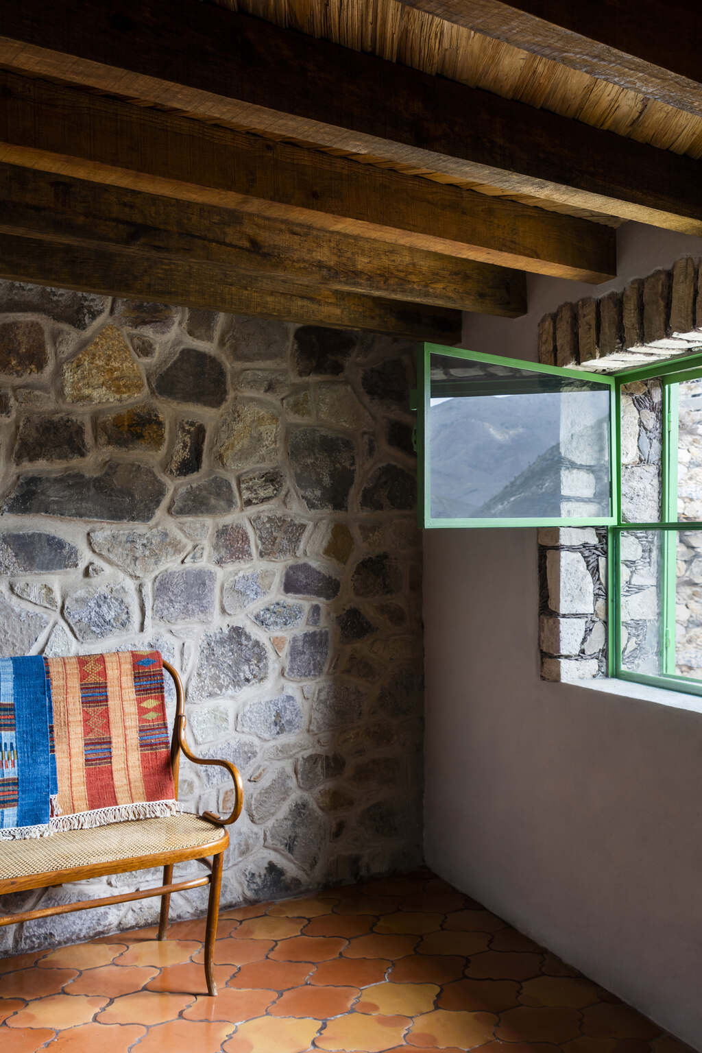 Located in Real de Catorce, a historic silver mining town established in the late 1700’s, Casa Georgina complies with strict building regulations that aim to maintain the site’s unique aesthetic character and architectural identity. In addition to height and sight-line restrictions, building mandates specify that all exterior walls be constructed with local stone, through a traditional building technique that is representative of the town. In tandem with the schematic development of the project, these building regulations initiated immediate design considerations at the scale of the detail. This included the repair, reinforcement, and extension of existing, solid stone walls on site, as well as the construction of new walls using a modified and more economical construction method involving stone, cast concrete, and CMU blocks.
