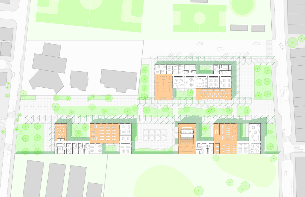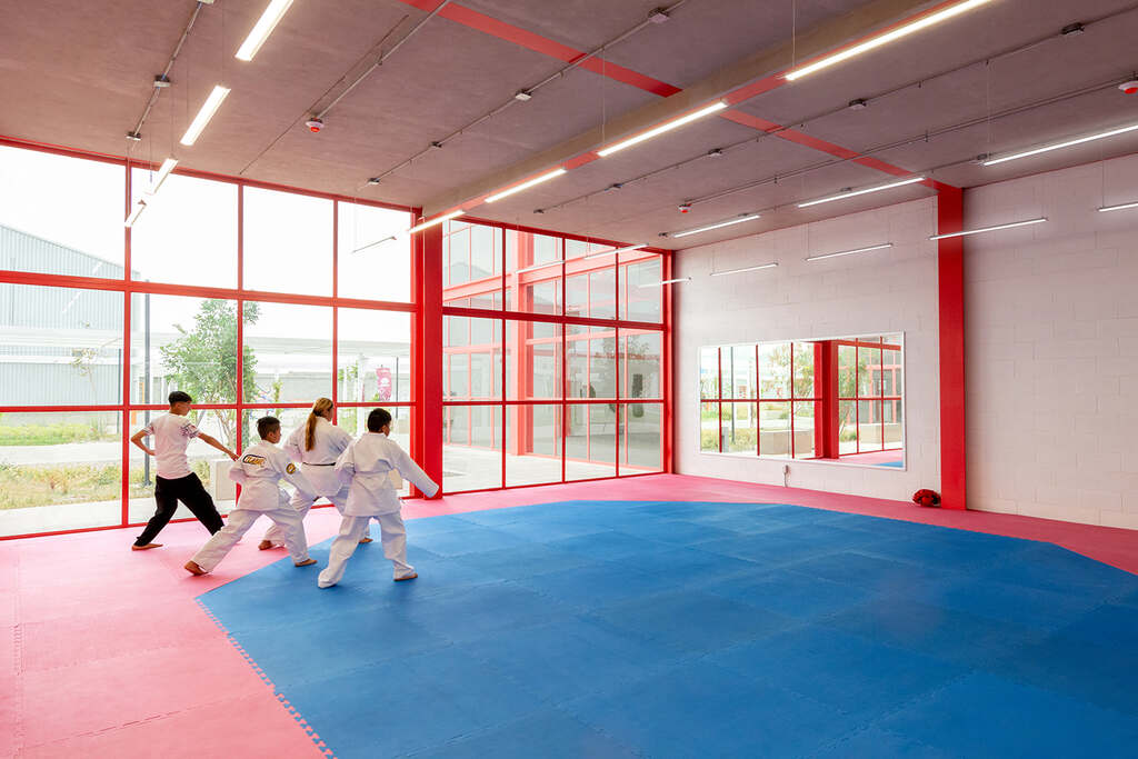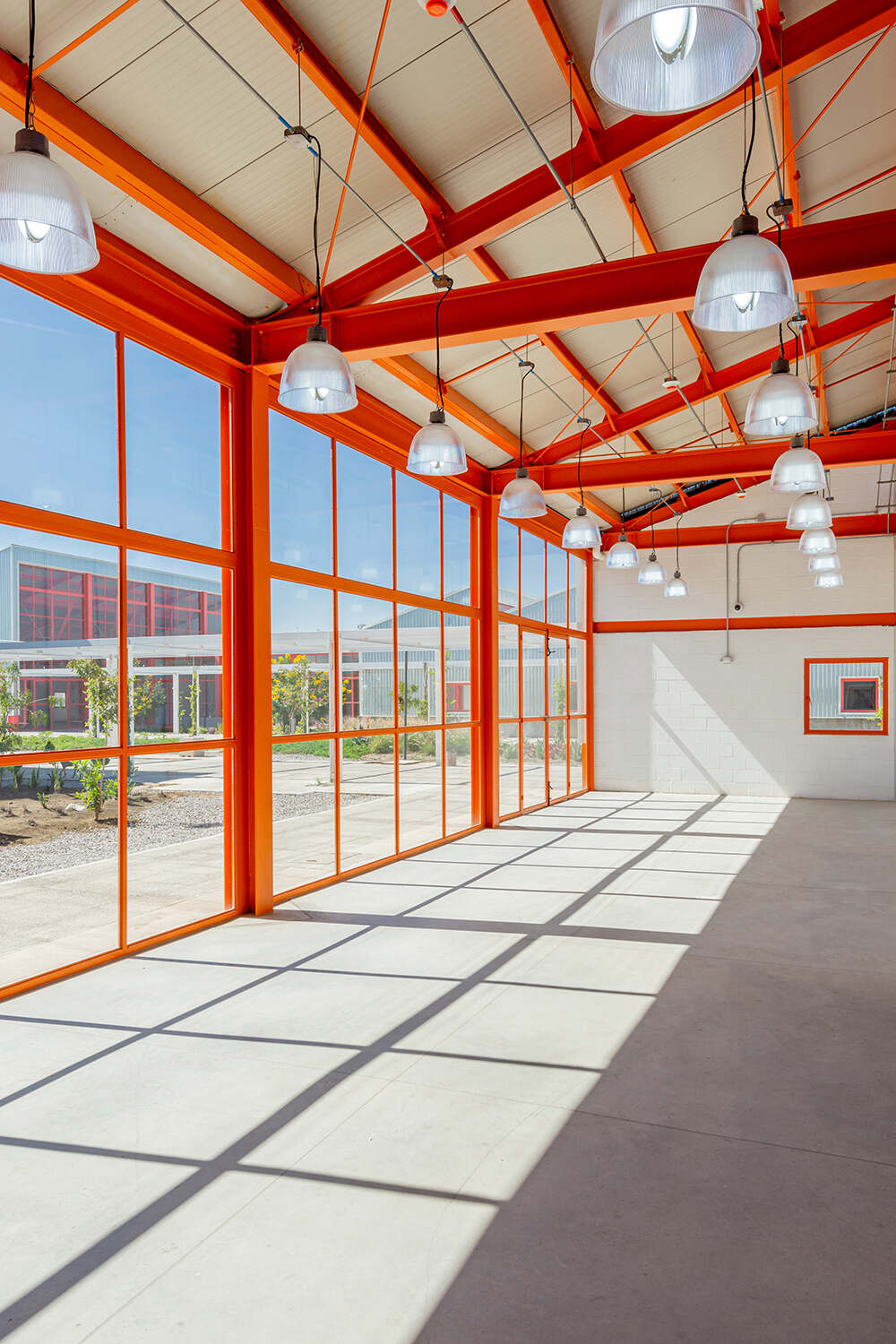 Taking cues from the industrial warehouse typologies of Tultitlán, the new buildings are based on a 5mx5m structural module that provides internal flexibility and supports future adaptations. The intense sunlight of the region is controlled and filtered to interior spaces through a series of skylights and courtyards. Corrugated metal sheeting uniformly wraps the exterior facades and playful sawtooth roof variations are placed in relationship to major programs. The interior steel structure of each building is highlighted with a unique color as a way-finding device: green for the social services and medical center; orange for the library and adjacent auditorium; and light pink for the arts and culture hub.
