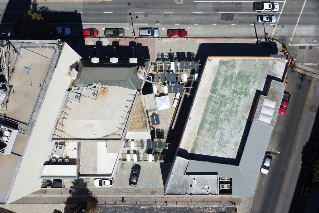 The two lightweight structural frames are composed of adapted telecom components. They sit atop the courtyard’s existing structure and custom V columns, supporting an array of photovoltaic, corrugated polycarbonate, and metal mesh panels. Connected to inverters and batteries on the ground, the photovoltaic panels provide power for the installation’s plug-in components (fans, dropdown cords, lights), the museum’s outdoor public programs, and the everyday needs and whims of courtyard visitors.