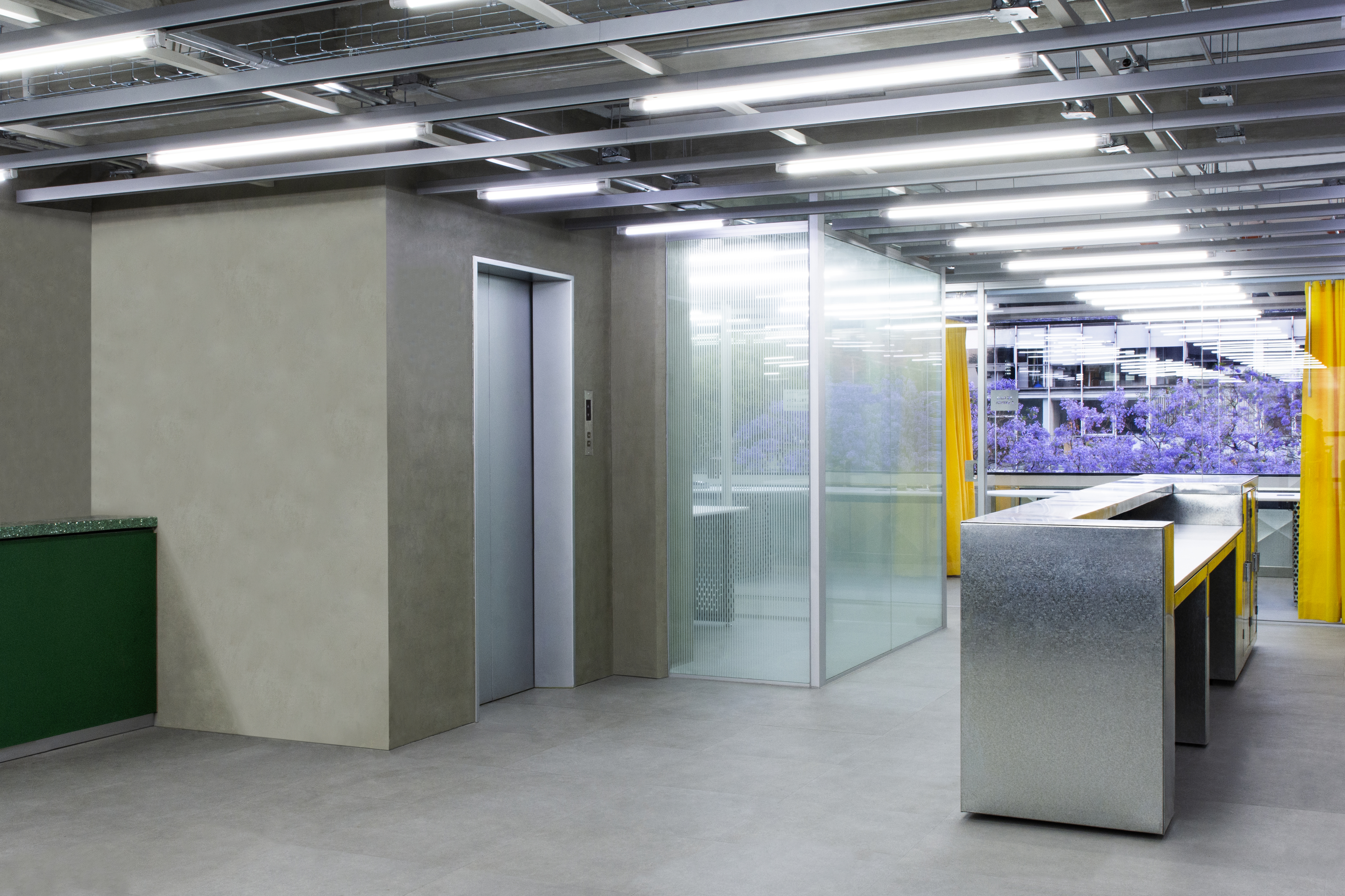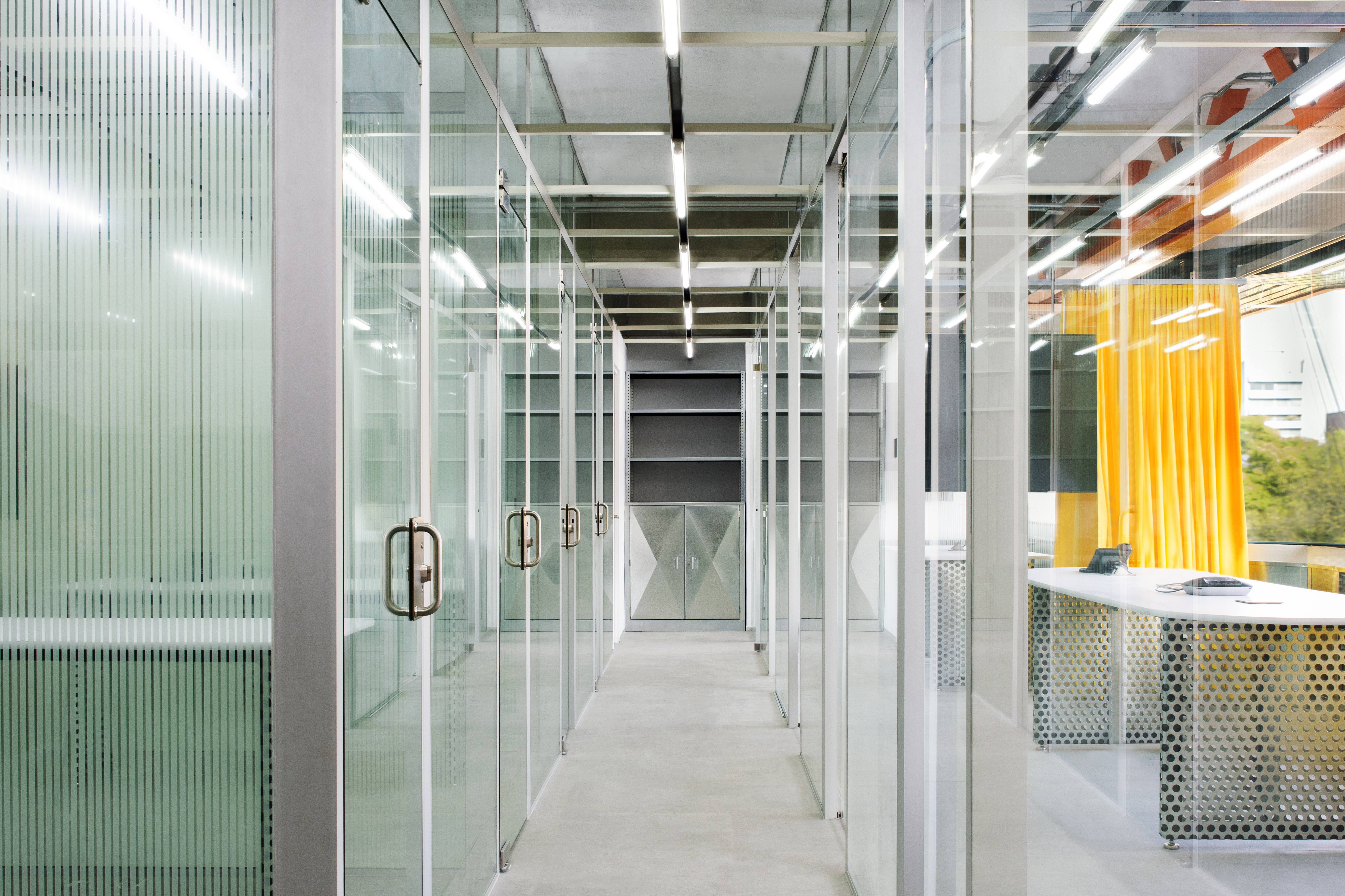 A la escala del detalle, se diseñó todo desde los acabados interiores hasta el mobiliario. Trabajando con una paleta de materiales compuesta por concreto aparente y aluminio pulido, el color y los patrones fueron introducidos en momentos específicos con el objetivo de resaltar actividades especiales. El terrazo verde con motas de granito negro, blanco y rosa fue utilizado en las barras de trabajo de la cocineta y del baño privado. Las cortinas color amarillo brillante proporcionan flexibilidad operativa a las salas de juntas en la fachada principal del edificio. Suspendidas de una serie de rieles, las cortinas permiten subdividir el espacio en tres distintas salas de juntas o ser completamente abiertas para crear una sola sala de conferencias. La lámina metálica lisa y multiperforada es utilizada para recubrir el mueble de recepción, las mesas de trabajo, y el mueble de guardado principal, en el cual cada empleado cuenta con un casillero donde poder almacenar artículos personales y equipo de trabajo.