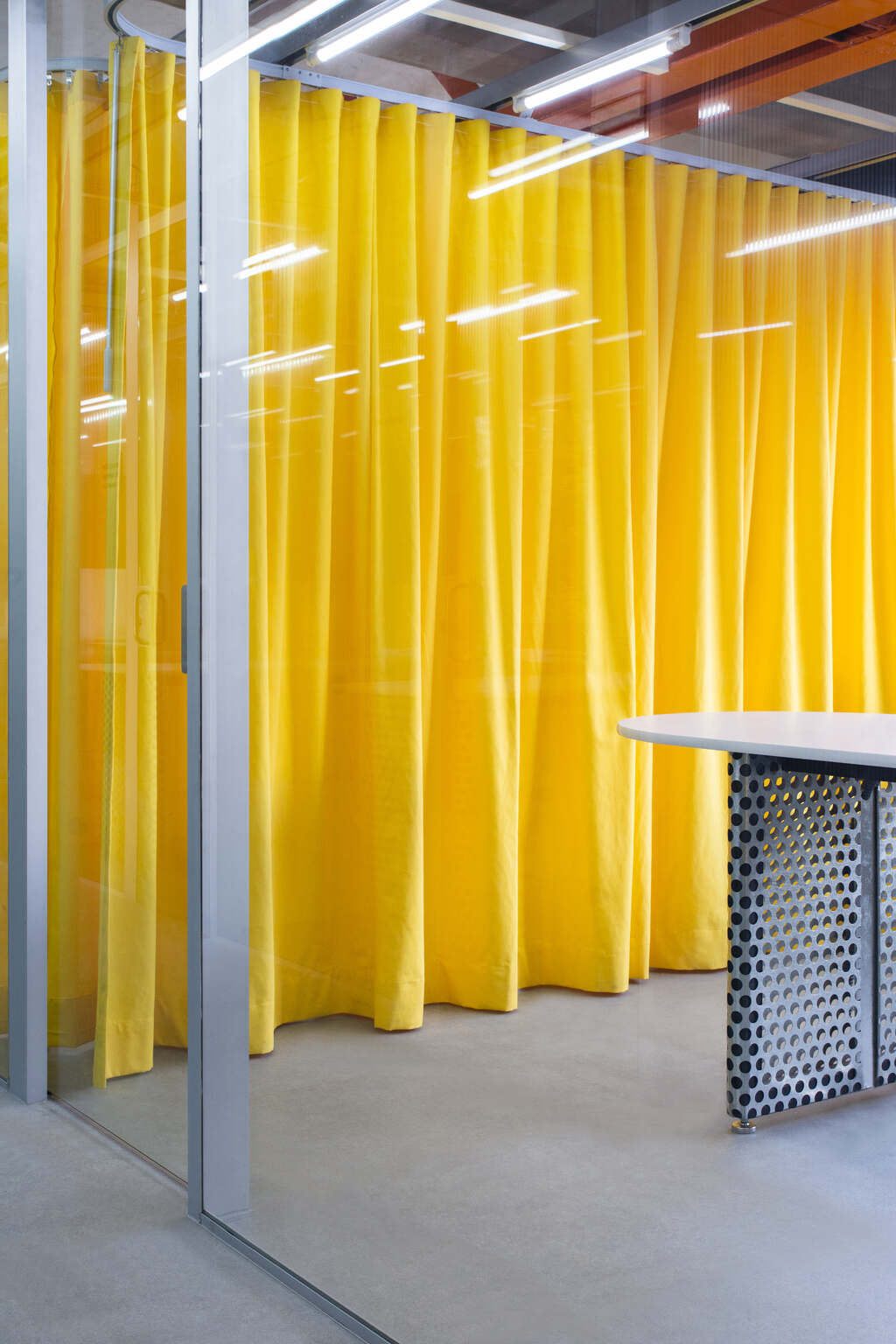 At the detail level, custom interior finishes and furniture were developed for the project. Working within a primary material palate of raw concrete and polished aluminum, color and pattern were introduced at point-specific moments to designate special programs. Green terrazzo flecked with black, white and rose granite form the working surfaces of the staff kitchen and private bathroom. Vibrant yellow curtains provide operational flexibility for meeting spaces at the front façade. Suspended from a series of tracks, they can be positioned to subdivide space into three separate meeting areas or pulled back to create one large conference room. Perforated steel sheets are used for the reception desk, working tables, and main storage unit, where each employee has a private locker for personal items and work equipment.