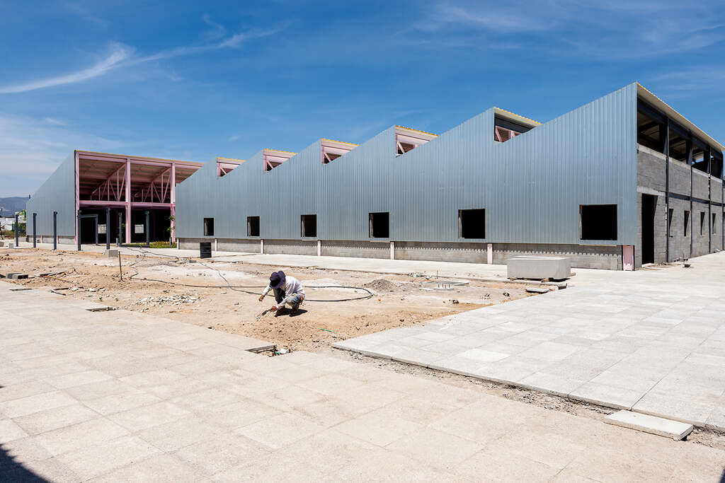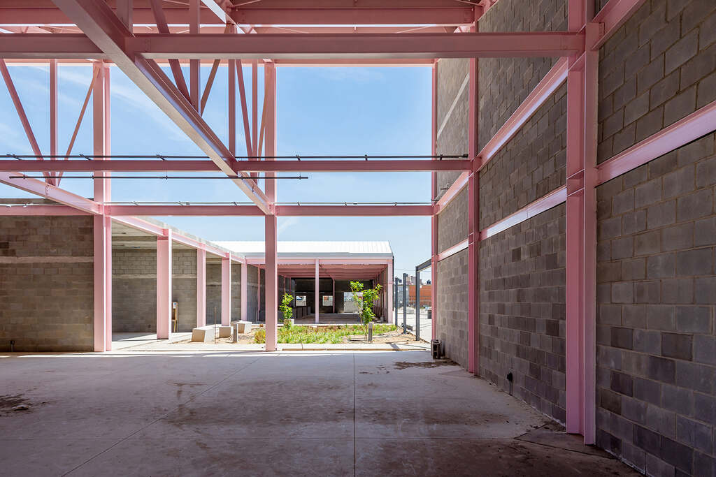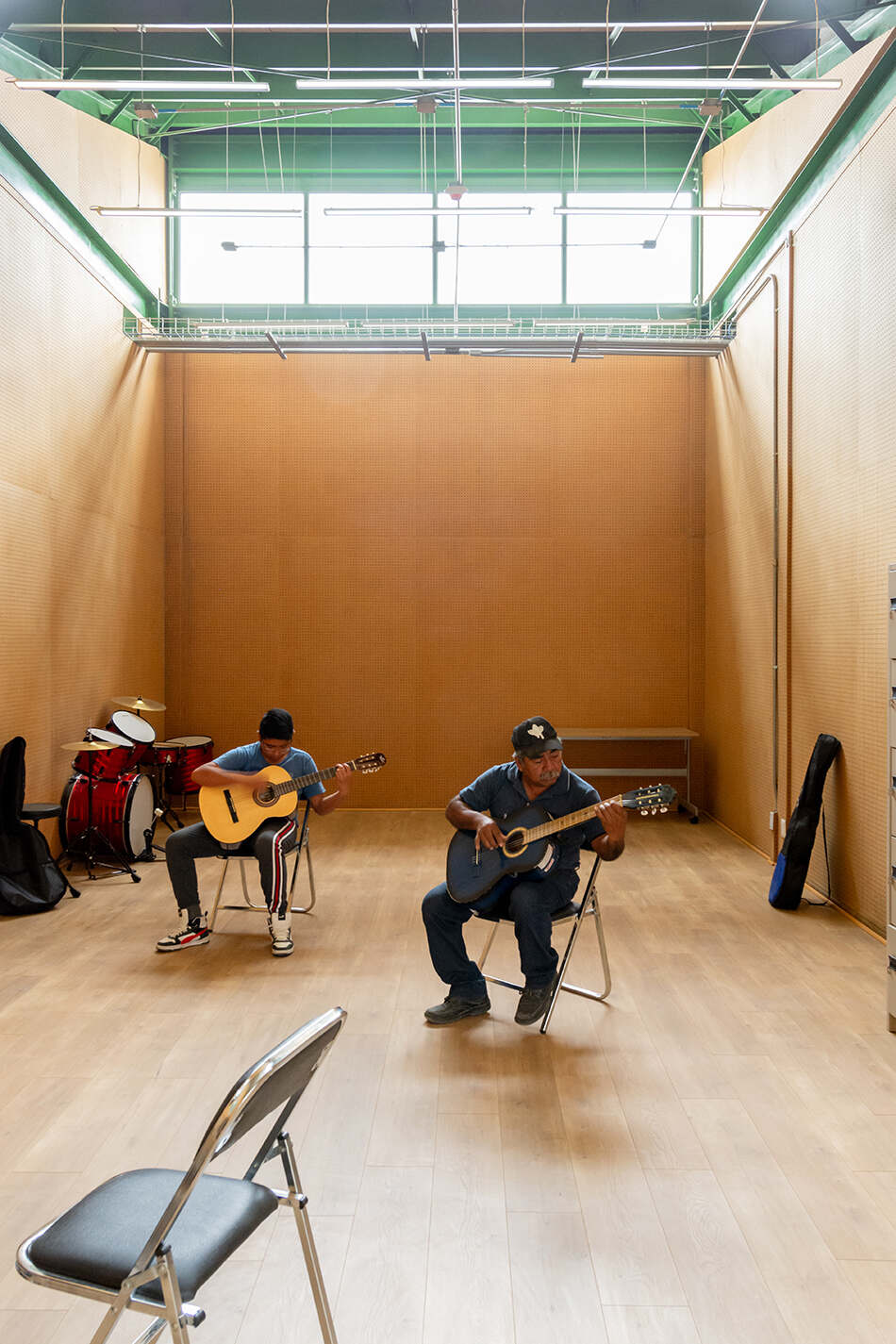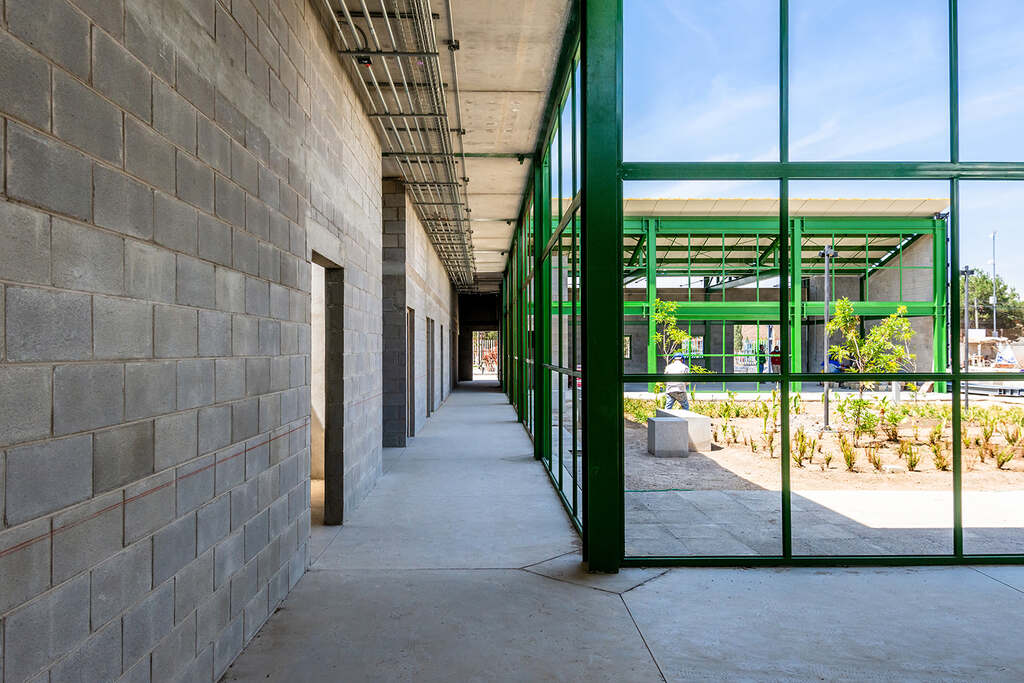 Taking cues from the industrial warehouse typologies of Tultitlán, the new buildings are based on a 5mx5m structural module that provides internal flexibility and supports future adaptations. The intense sunlight of the region is controlled and filtered to interior spaces through a series of skylights and courtyards. Corrugated metal sheeting uniformly wraps the exterior facades and playful sawtooth roof variations are placed in relationship to major programs. The interior steel structure of each building is highlighted with a unique color as a way-finding device: green for the social services and medical center; orange for the library and adjacent auditorium; and light pink for the arts and culture hub.
