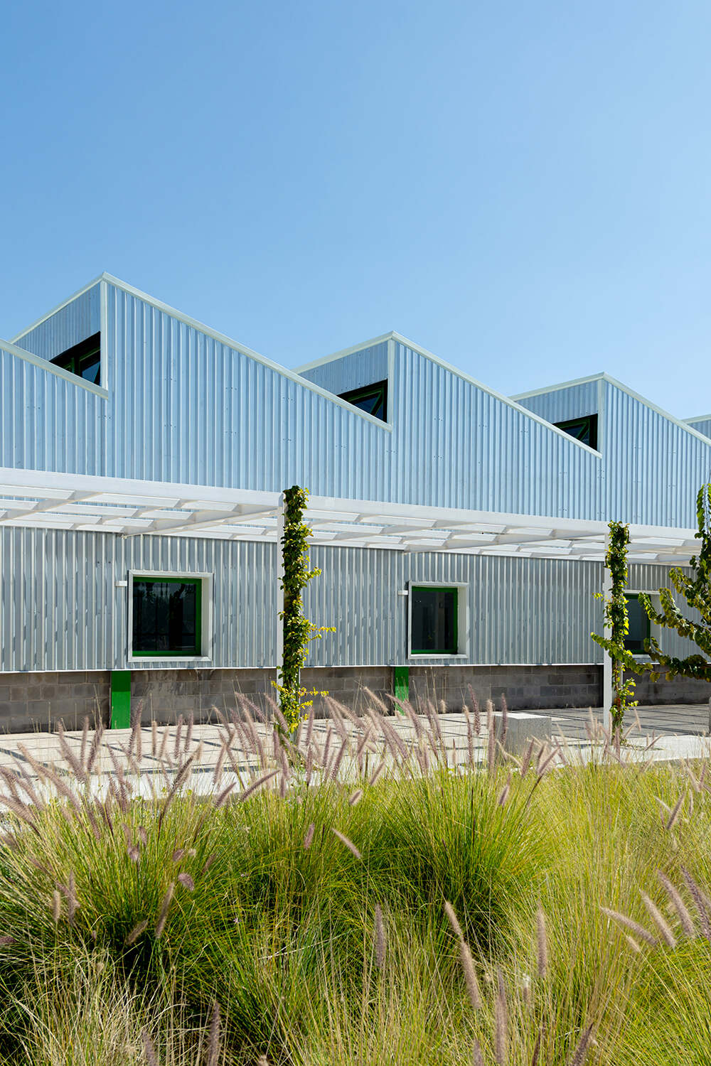 Tomando como ejemplo las tipologías de las bodegas industriales de Tultitlán, los nuevos edificios se basan en un módulo estructural de 5mx5m el cual proporciona flexibilidad interior y permite adaptaciones futuras. Los intensos rayos de sol de la región son controlados y filtrados hacia el interior de los espacios a través de una serie de tragaluces y patios. El metal corrugado envuelve uniformemente las fachadas exteriores y lúdicas variaciones de cubiertas tipo dientes de sierra son colocadas en relación con ciertas actividades interiores. La estructura metálica interior de cada edificio es resaltada a través de colores únicos los cuales funcionan como dispositivo de navegación: el verde para los servicios sociales y el centro médico; el naranja para la biblioteca y el auditorio adyacente; y el rosa pálido para las artes y el centro cultural.