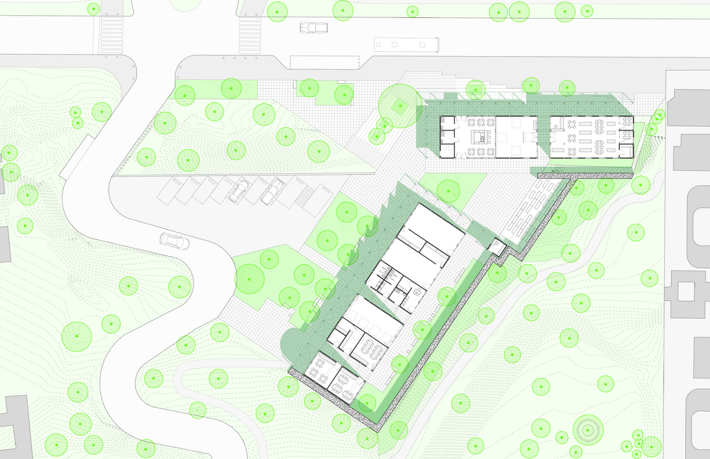 Built into the hillside of the Sierra de Guadalupe Mountain Range, the Casa de Cultura Real del Bosque is composed of two bars that sit on an elevated public plinth above street level. Urbanistically, the public space of the sidewalk is extended through a series of steps and terraced platforms that welcome visitors, acting simultaneously as a meeting point, hang-out zone, and project entrance. The first project bar is positioned parallel to the street and perpendicular to the neighboring social housing on the west. The second project bar is skewed at a 40-degree angle to align with the slope of existing topography and park footpaths. Each bar houses a collection of individual volumes that are linked by an exterior pergola. A playful set of roof conditions (saw-tooth, flat with pixelated skylights, and barrel-vault) cap each of the volumes, creating distinctive interiors and natural lighting conditions for a diverse set of arts and culture programs. An amphitheater sits at the hinge-point of the project and acts as a central meeting place for the small library, gallery, cafe, dance studio, and children’s art space on site.