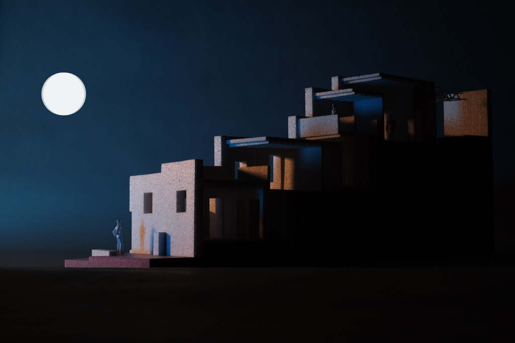 Casa Georgina is composed of two apartment units built into the steep slope of the Sierra de Catorce mountains in the northern Mexican state of San Luis Potosí. The project sits within a walled garden that contains an existing house and builds upon a series of stone ruins, engaging them through a play of addition and subtraction. Three stepped walls organize the design scheme: wall one contains exterior circulation; wall two frames the interior living spaces; and wall three divides the project from the neighboring property. These walls protect interior spaces from intense direct sunlight from the east and west, and structure a collection of terraced volumes. Roof patios open to the south and provide expansive views of the surrounding landscape.