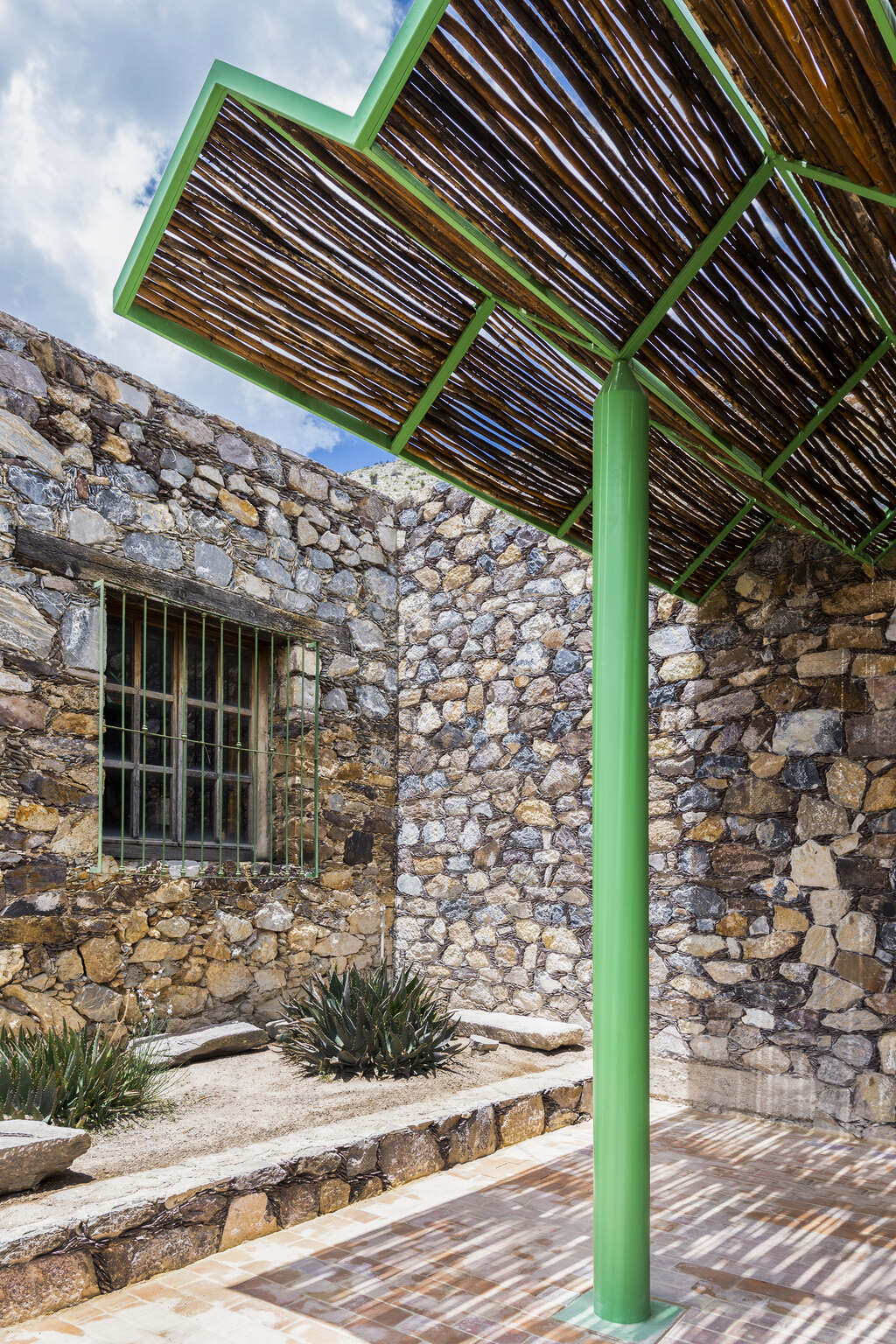 Localizado en Real de Catorce, un antiguo pueblo minero fundado durante el siglo XVIII para llevar a cabo la sustracción de plata, el proyecto cumple con las estrictas regulaciones de construcción locales y fue revisado públicamente por una junta supervisora. Además de temas de altura y restricciones de líneas de visión, las regulaciones de construcción especifican que todos los muros exteriores deben ser construidos con piedra local por medio de un sistema constructivo tradicional representativo del pueblo. En paralelo al desarrollo esquemático del proyecto, dichas regulaciones de construcción iniciaron consideraciones de diseño inmediatas que lo impactaron hasta la escala del detalle. Esto incluyó la reparación, reforzamiento y expansión de muros sólidos de piedra existentes en el sitio, así como también la construcción de nuevos muros utilizando un método de construcción modificado y más económico, el cual utiliza piedra, cemento colado y bloques de cemento.