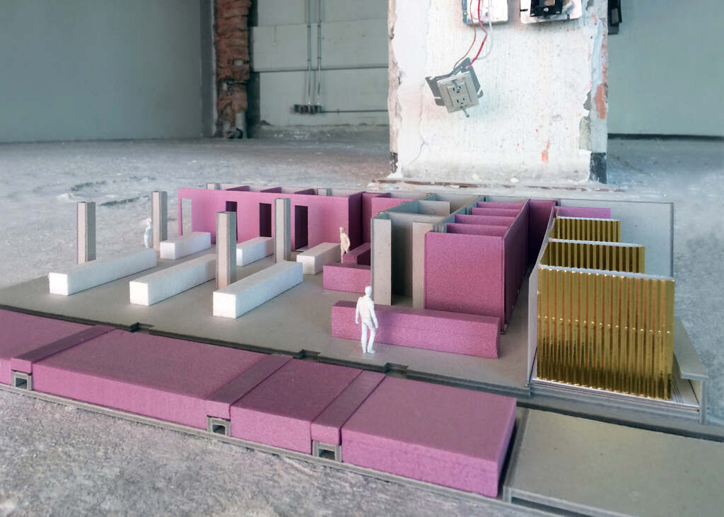 New program elements are inserted through a series of linear bars: meeting rooms line the front façade; private offices run along existing walls; and the staff kitchen is placed against the building’s core. The remaining area is left free of partitions, occupied solely by six oversized work tables. A module of 60 x 60 centimeters, extracted from the existing structural grid, dictates the proportion and rhythm of inserted elements. In addition, this module organizes an open ceiling plan through a series of linear ribs that hold lighting and provide support for building technology systems. Structural beams, wiring, and ductwork are left exposed, serving as a form of display for the company’s work.