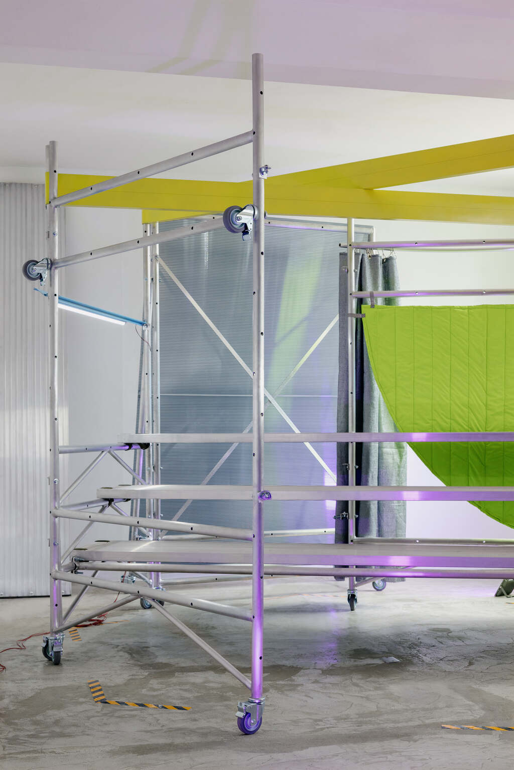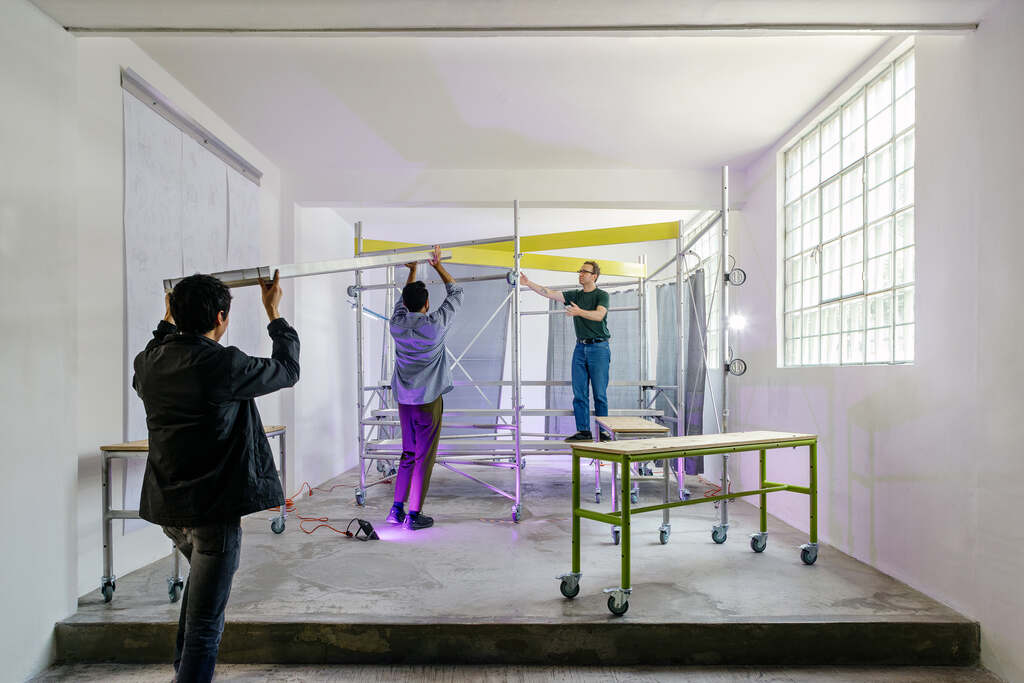 The installation embraces LIGA as a “third space,” a site that exists outside the confines and routines of daily life in which alternative social dynamics can unfold. Zones for gathering, making, and resting are bundled together within a mobile, open structure that sits within the gallery. Conceived as a prototype that blurs the lines between architecture, infrastructure and industrial design, the base organization of the piece takes the form of a hexagon composed of six different aluminum frames, all linked together with operable hinges. To accommodate a variety of uses throughout the day, discreet furniture-scaled modules unfold from the center frame to extend living space throughout the gallery and out into the entrance hallway. Materials and construction methods embrace industrialized systems and prefabricated parts that allow for the structure to be modified over the length of the exhibition calendar.