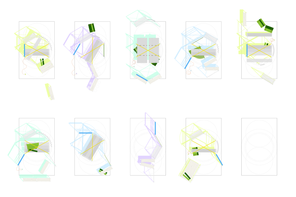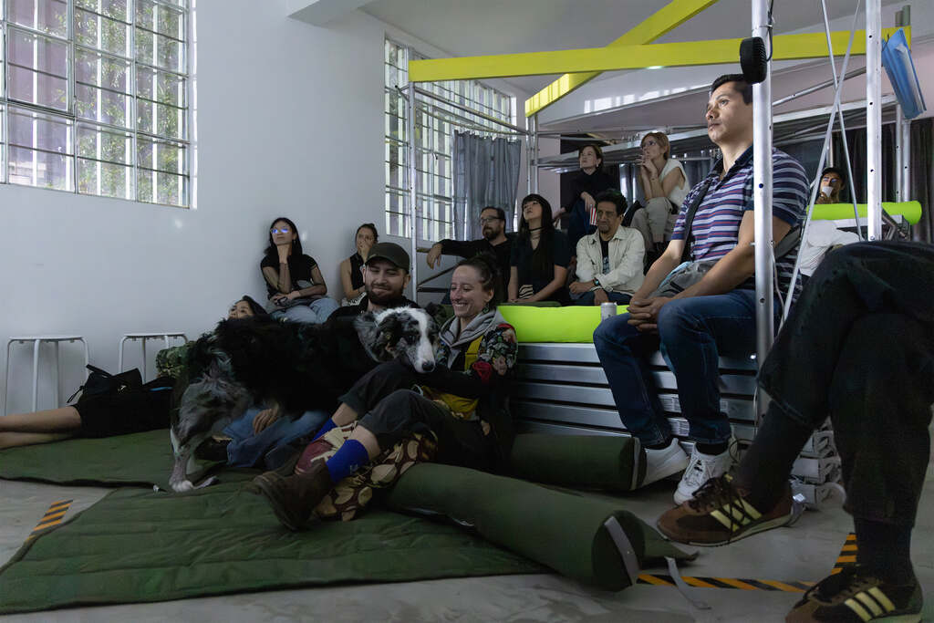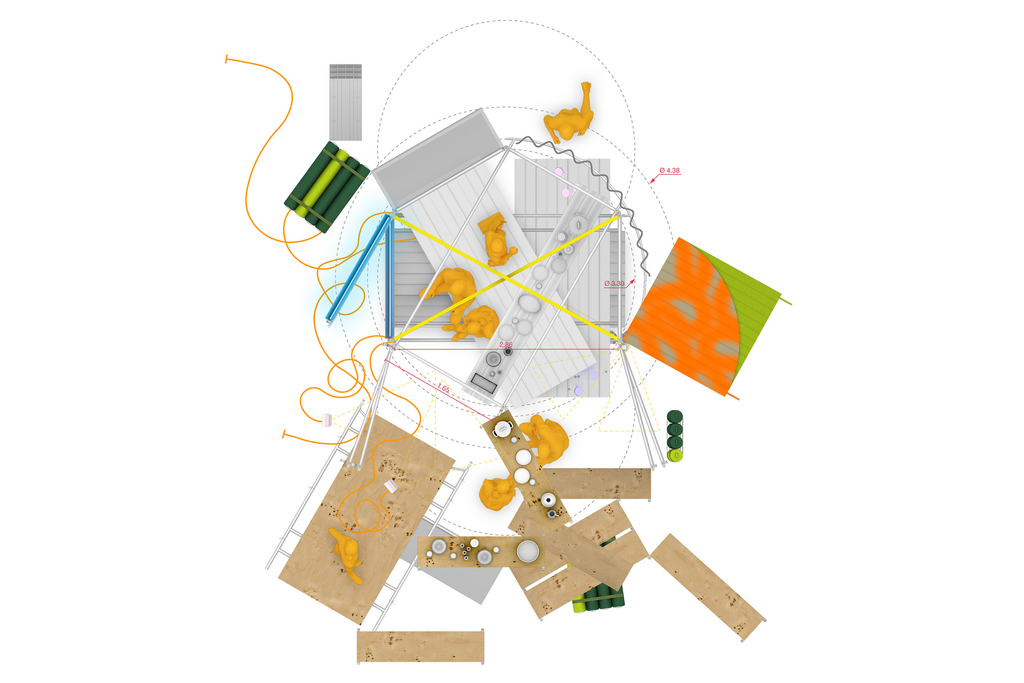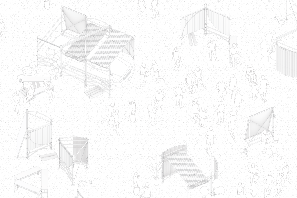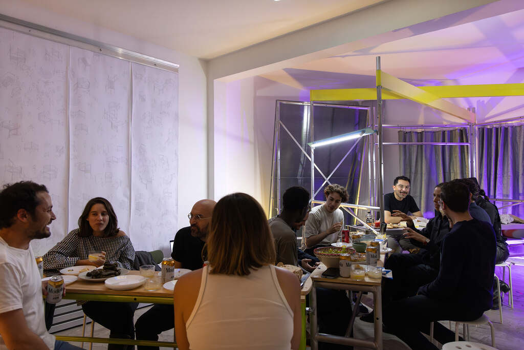 La instalación aprovecha el espacio de LIGA como un “tercer espacio,” el cual existe en un lugar fuera de los confines y la rutina de la vida cotidiana, y en donde puedan desenvolverse dinámicas sociales alternativas. Zonas para el encuentro, la producción y el descanso son agrupadas en un marco estructural móvil y abierta, el cual se posiciona dentro de la galería. Concebida como un prototipo que difumina las fronteras entre arquitectura, infraestructura y diseño industrial, la organización base de la pieza toma la forma de un hexágono compuesto por seis marcos de aluminio diferentes, todos unidos entre sí mediante bisagras operables. Para satisfacer distintos usos a lo largo del día, discretos módulos a la escala del mobiliario se desenvuelven de la estructura central para extender el espacio habitable a través de la galería y hacia el pasillo de acceso. Los materiales y métodos de construcción aprovechan algunos sistemas industrializados y partes prefabricadas, permitiendo a la estructura adaptarse y ser modificada a lo largo de la duración total del calendario de la exhibición.