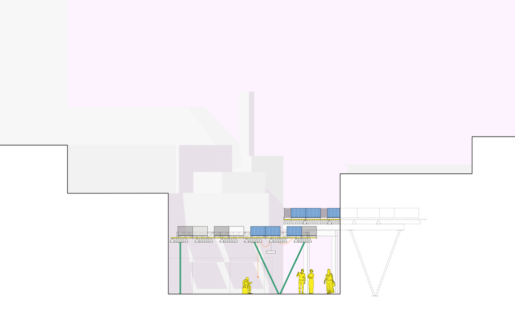 Las dos estructuras ligeras están compuestas por componentes de telecomunicación adaptados. Se asientan sobre la estructura existente del patio y sobre dos nuevas columnas en forma de “V”, soportando una serie de paneles fotovoltaicos, de policarbonato corrugado y de malla metálica. Conectados a inversores y baterías a nivel de piso, los paneles fotovoltaicos suministran energía a los componentes enchufables de la instalación (ventiladores, cables de conexión, luces), a los programas públicos exteriores del museo, y a las necesidades y deseos cotidianos de los visitantes del patio.