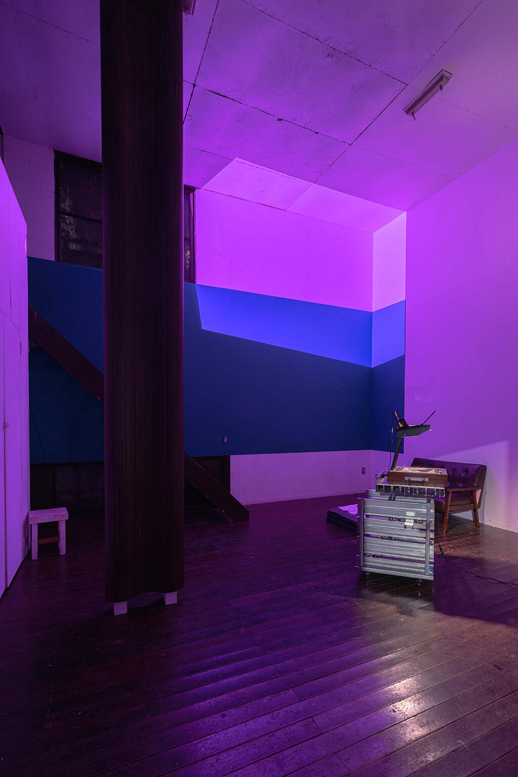 My Robot is a mobile support structure. Operating as part furniture and part infrastructure, the installation acts as a literal and conceptual extension of the Shinjuku White House service spaces. Built out of stacked steel profiles and stored in the on-site closet while not in use, My Robot can be rolled out at specific moments in time: to act as a step ladder during installations in the main gallery space; to provide an additional display surface or pedestal when the existing wall space is insufficient; or to extend public programming onto the side street, where it might function as a beacon, bar table, or DJ booth.